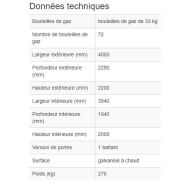 Selon le modèle, elle peut contenir des bouteilles de 50 litres, de 33 kg uniquement, de 11 kg seulement, ou avec des compartiments arrangés pour mettre des bouteilles de 33 kg et 11 kg à la fois. Les versions personnalisées disposent de toit et de gouttière pour évacuer l’eau de pluie.
