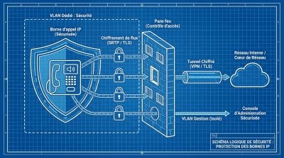 - Segmentation réseau : les bornes occupent un VLAN dédié, isolé des réseaux bureautiques et de supervision générale. Les flux autorisés se limitent aux communications nécessaires (audio SIP, supervision, mises à jour).