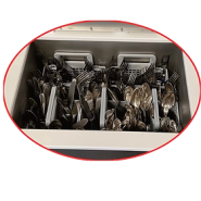 - Les couverts propres et mouillés sont insérés dans la machine.