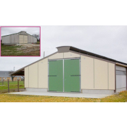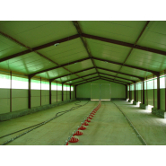 - Bâtiment avicole préfabriqué avec une structure en acier et équipé de panneaux sandwich ;