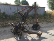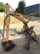 - La tête interchangeable ou le godet qui se charge suivant un sens pointé vers le véhicule porteur. Le godet peut être remplacé par une tarière hydraulique, des grappins, un outil de creusement ou de démolition.